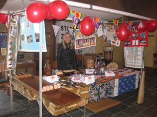Angela bij onze vanwege het tienjarig bestaanfeestelijk met slinger en ballonnen versierde kraam |